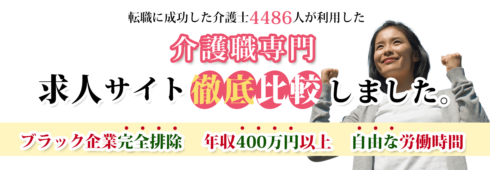 介護施設とも繋がりが深く、段違いの良い条件で求人を提供できているからこそ、業界トップクラスの利用者、転職成功者を誇り、介護職の方の満足度が高いのがうなずけます。
